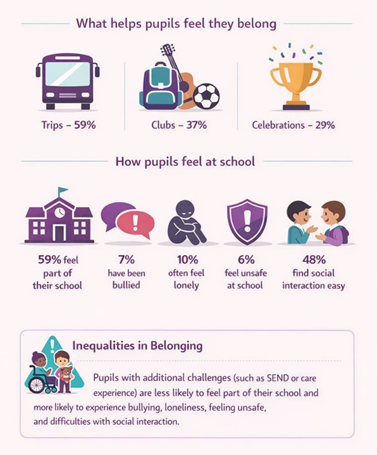 The Oxwell survey results suggest that when children and young people in education settings can interact freely and socially around a shared purpose like a trip, a hobby or a celebration they are more able to achieve these things that contribute to their overall sense of belonging.